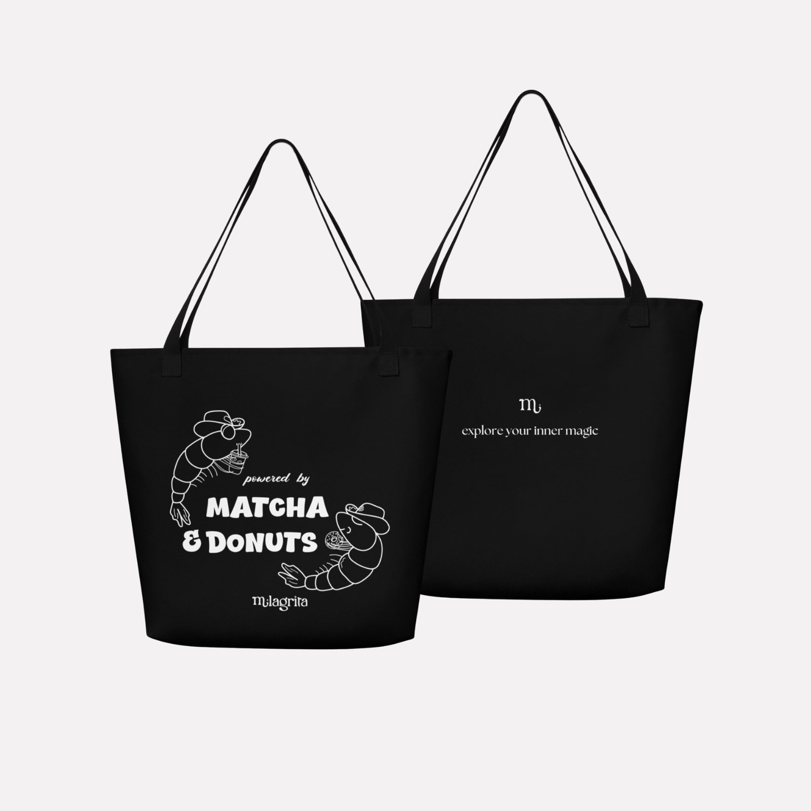 Unique design from Milagrita: Powered by Matcha & Donuts – Tote Bag with Cowboy Shrimps